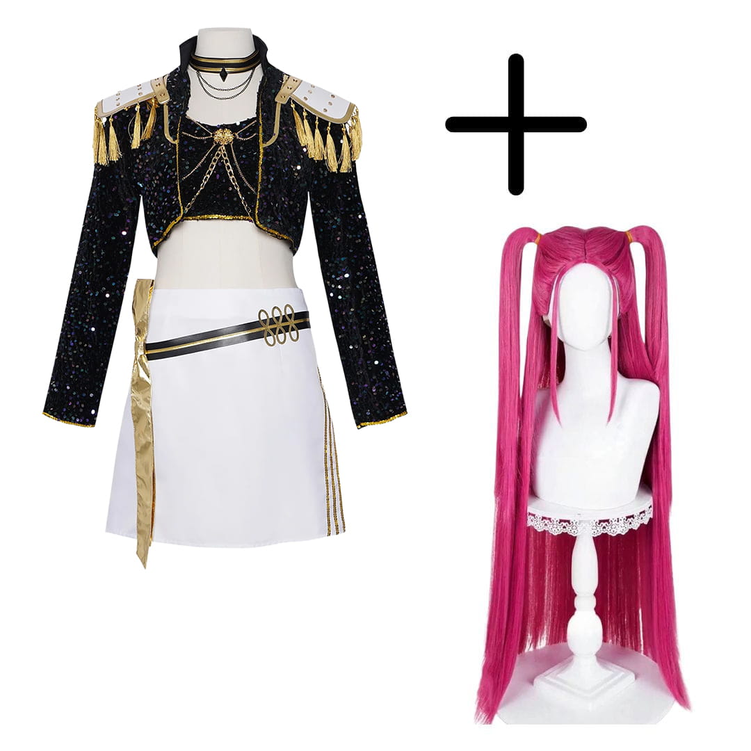 Ta wersja cosplayu Mira to prawdziwa gratka dla fanów efektownych stylizacji scenicznych. Cekinowy czarny top, holograficzna spódniczka i złote akcenty tworzą zestaw, który od razu przyciąga uwagę. Dodatkowo – kultowa różowa peruka z wysokimi kucykami wciąż gra tu pierwsze skrzypce!