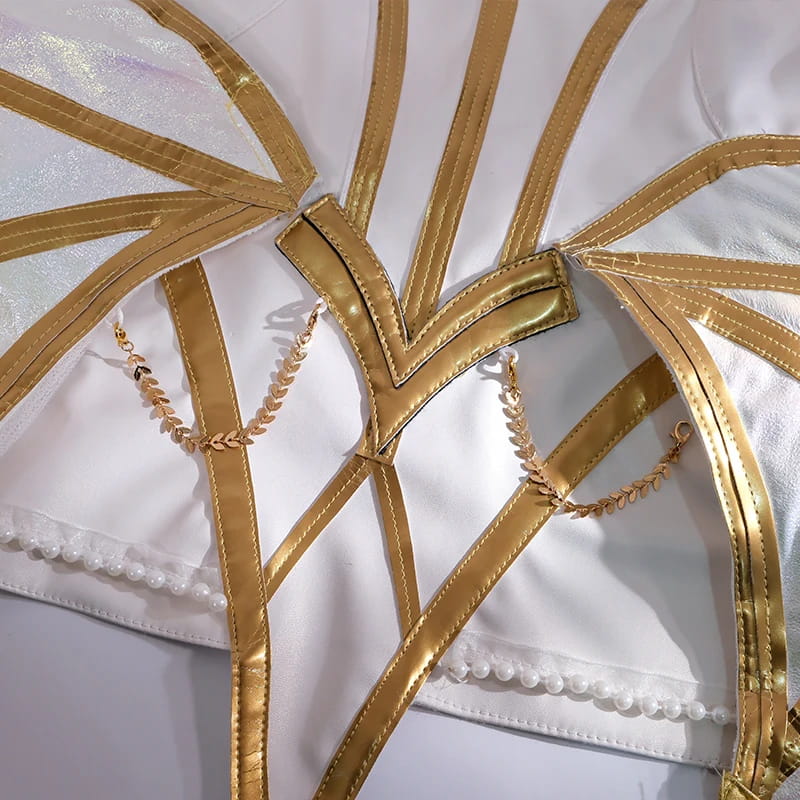 Elegancka biała suknia ze złotymi zdobieniami i akcesoriami, wiernie odwzorowana z gry. Idealna na konwenty i sesje cosplayowe.