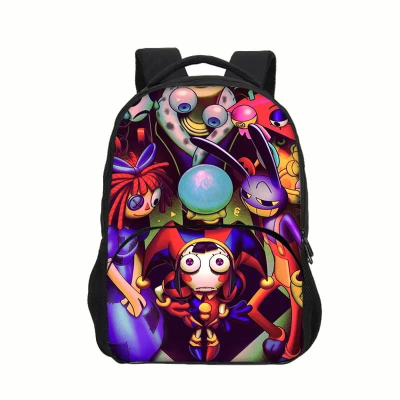 Jeśli chcesz mieć przy sobie wszystkich ulubionych bohaterów z cyfrowego cyrku, ten plecak jest strzałem w dziesiątkę! W centrum stoi Pomni, a wokół niej – cała szalona ekipa: Jax, Ragatha, Gangle, Kinger, Bubble i inni, przedstawieni w stylizowanej, niemal trójwymiarowej grafice przypominającej cutscenę z gry lub filmu animowanego.