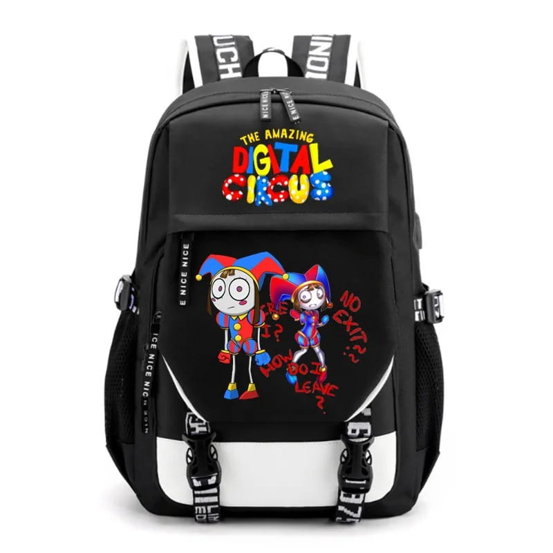 Nie wszystkie cyrki są wesołe – szczególnie, gdy jesteś w jednym uwięziony! Ten plecak z serii „The Amazing Digital Circus” pokazuje Jaxa i Pomni w ich bardziej zdezorientowanej, zagubionej wersji. Hasła „No exit?”, „How do I leave?” i „FREE?” to cytaty, które zna każdy fan animacji – idealne dla tych, którzy lubią mroczniejsze oblicze tej kreskówki.