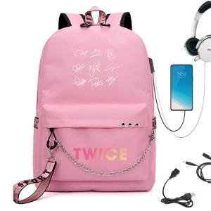 Jeśli TWICE to Twój ulubiony girlsband, a każda z dziewczyn ma swoje miejsce w Twoim sercu – ten plecak jest stworzony właśnie dla Ciebie. Ilustracje wszystkich członkiń zespołu i wyraźne logo TWICE od razu przyciągają wzrok. Do tego łańcuszek, pastelowe akcenty i port USB, który pozwoli Ci naładować telefon nawet w trakcie lekcji – to funkcjonalny i stylowy wybór do szkoły i nie tylko.